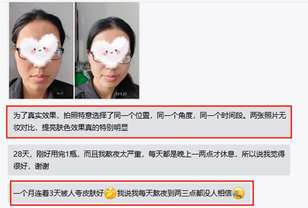 期间有一位用户直接发来了使用28天的对比图,说是熬夜到两三点都被人赞皮肤好。