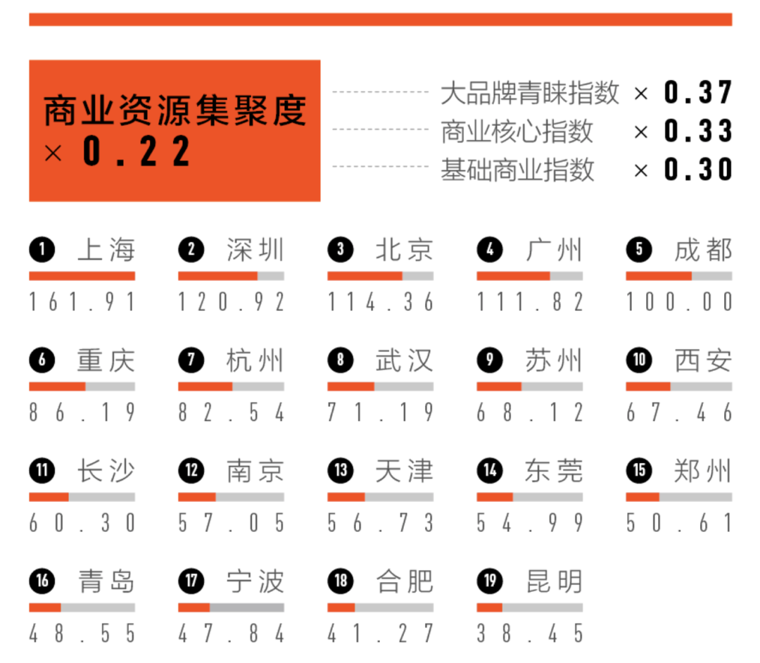 总结最近10年的榜单,新一线城市俱乐部阵容逐渐清晰。成都、杭州、重庆、西安、苏州、武汉、南京、天津、长沙、青岛。自榜单发布起,它们便一直位列“新一线城市”。可以说,它们是北上广深之后,最稳的城市。郑州、东莞、宁波、沈阳、无锡、佛山、大连、合肥、昆明、厦门等。这些城市,都曾位居新一线城市阵营,但发挥不是很稳定,偶尔会滑出新一线城市榜单。以下是2023年入选《榜单》的30个二线城市名单👇对比可以发现,昆明从二线城市紧急新一线城市,佛山从新一线城市跌落至二线城市,但稳居二线城市的首位。排在佛山之后的是沈阳,这是东北三省排名最高的城市。此外,南宁、泉州、绍兴、金华、常州等城市的排名有上升。商业资源聚集度包含大品牌青睐指数、商业核心指数、基础商业指数,直接反映一座城市在商业领域的硬实力。四个一线城市与15个新一线城市在商业资源聚集度的排名如下👇