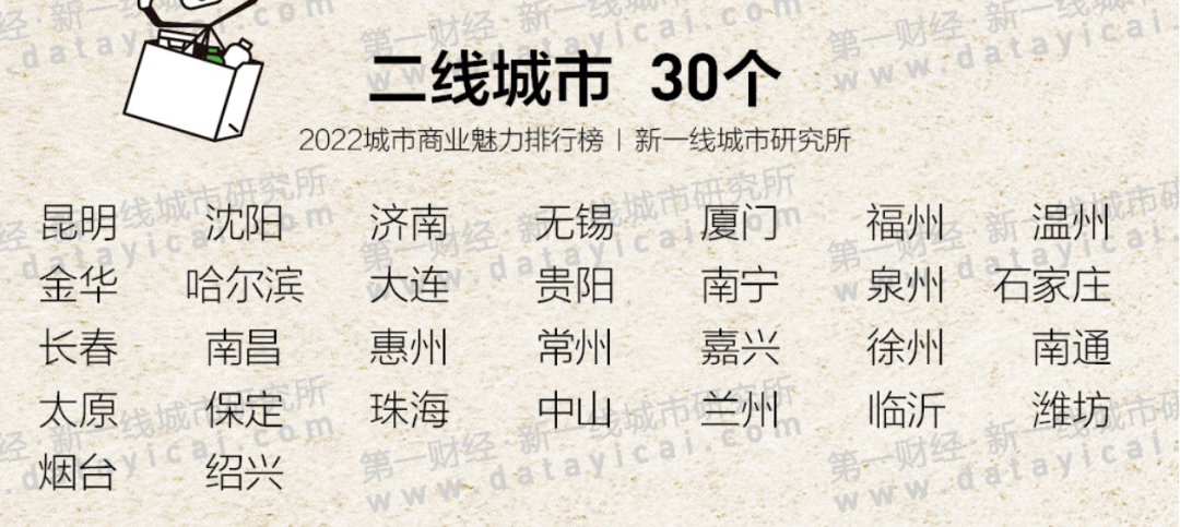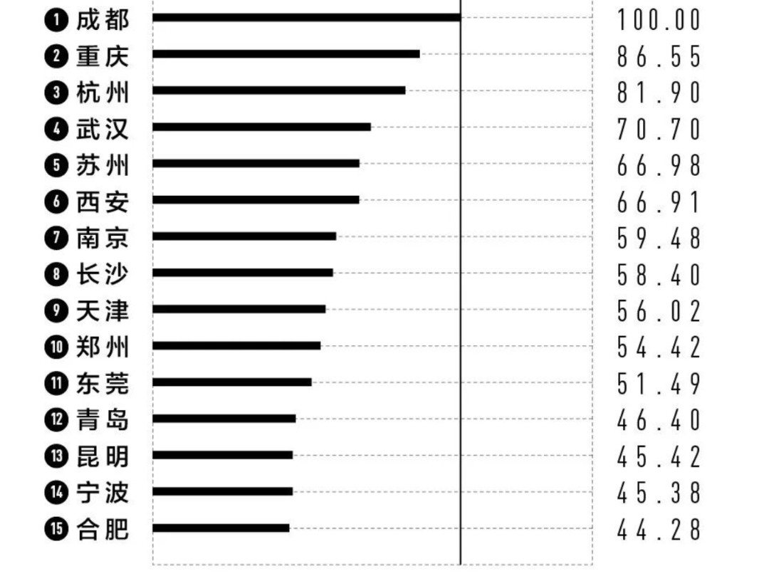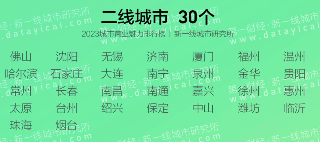 上海是中国最大、最精致的商业城市,排在第一,众望所归。广州是享誉全球的千年商都,商贸是广州最显著的城市特征之一,在商业魅力榜上超过深圳这个年轻的城市,也实属正常。本来一线城市之后要叫二线城市,但考虑到成都、杭州、武汉这些城市迅猛的发展势头,呈现出一种1.5线城市的观感。所以第一财经给这类城市取了新名词,叫做:新一线城市。成都、重庆、杭州、武汉、苏州、西安、南京、长沙、天津、郑州、东莞、青岛、昆明、宁波、合肥。与上一年相比,比较明显的变化是,西安反超武汉,青岛排名上升三位,昆明重返新一线,佛山跌出新一线。从地区分布来看,15个新一线城市中,南方城市占了11个,北方城市仅剩下4个,分别是西安、天津、郑州、青岛。