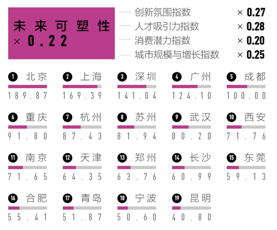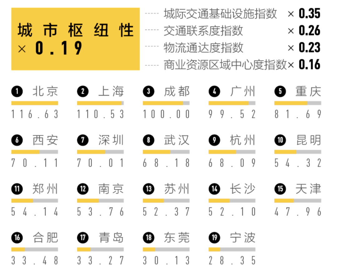 “城市枢纽性”包含城市交通基础设施指数、交通联系度指数、物流通达度指数、商业资源区域中心度指数,主要城市的排名如下