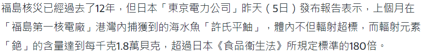 据雅虎新闻报道,东京电力近日在福岛第一核电厂内捕获的许氏平鮋身上,验出了放射性元素“铯”“铯”的含量达到每公斤1.8万贝克(Bq),为日本食品卫生法所定标准值的180倍。