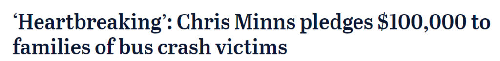 新州州长Chris Minns承诺,将通过他的自主基金向受Greta巴士事故影响的家庭捐款10万澳元。