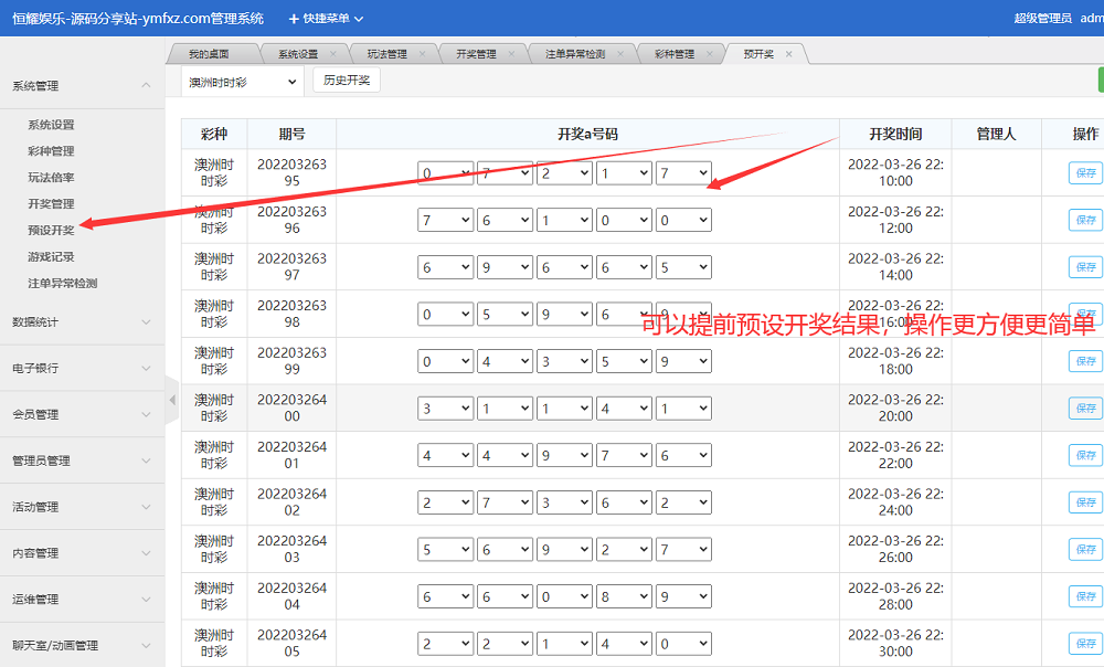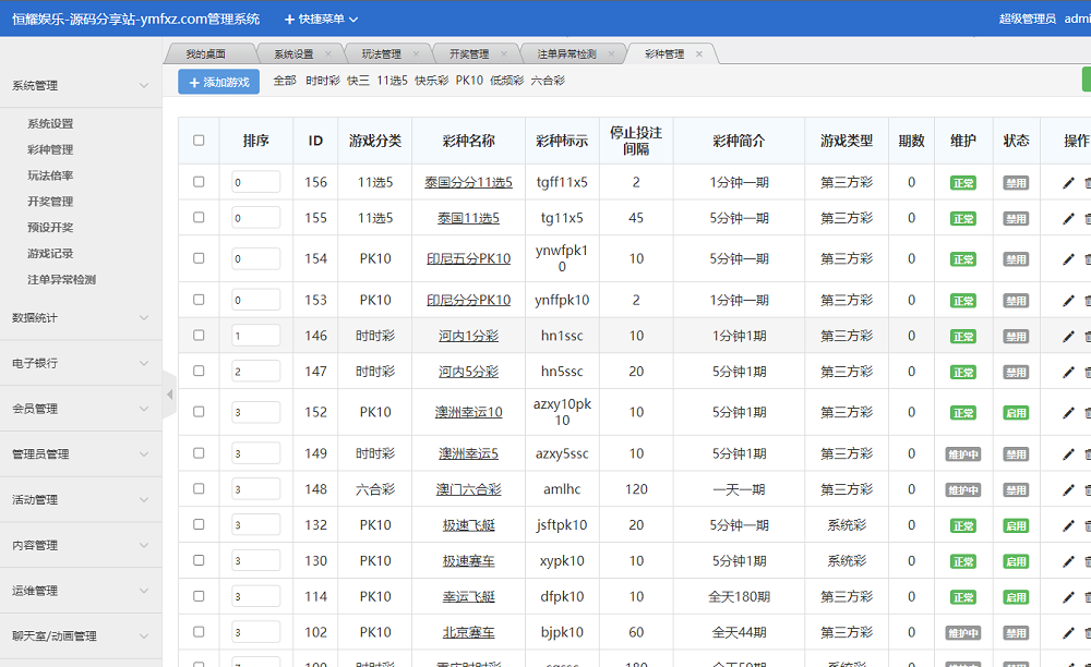 系统开奖和控制优化,可以自由添加彩种,已经添加多种彩,包含澳洲5,澳洲10等等源码你们还可以进行二开