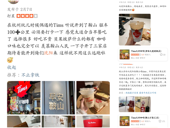 “跋山涉水从沈阳来鞍山喝Tims,贝果还有可颂真是太好吃了。”2023年初,Tims天好咖啡辽宁首店落户“钢城”鞍山,不少省会城市沈阳的大众点评网友便按图索骥,有的不惜驱车100多公里专程前往鞍山门店,打卡点评。