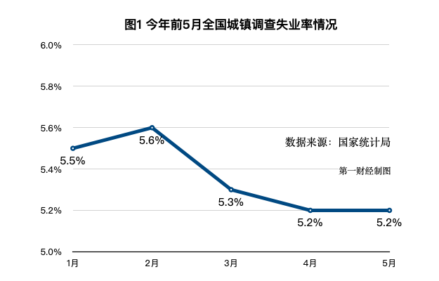 5月份,全国城镇调查失业率为5.2%,与4月持平。对照国家统计局此前发布的月度数据可以看到,在2月达到5.6%之后,3月下降为5.3%;5月全国城镇调查失业率比1月下降0.3个百分点,比2月高点时下降0.4个百分点。