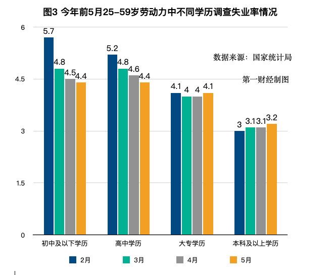 统计局数据显示,在5月25-59岁劳动力中,初中及以下学历、高中学历、大专学历、本科及以上学历劳动力调查失业率分别为4.4%、4.4%、4.1%、3.2%。