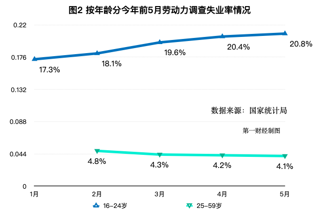从劳动力年龄结构看就业情况,5月,16-24岁、25-59岁劳动力调查失业率分别为20.8%、4.1%。对照4月数据,25-59岁劳动力调查失业率下降了0.1个百分点;16-24岁劳动力调查失业率提高了0.4个百分点。