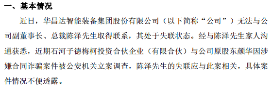导读:6月15日晚间,华昌达发布公告,公司无法与公司副董事长、总裁陈泽取得联系,其处于失联状态。