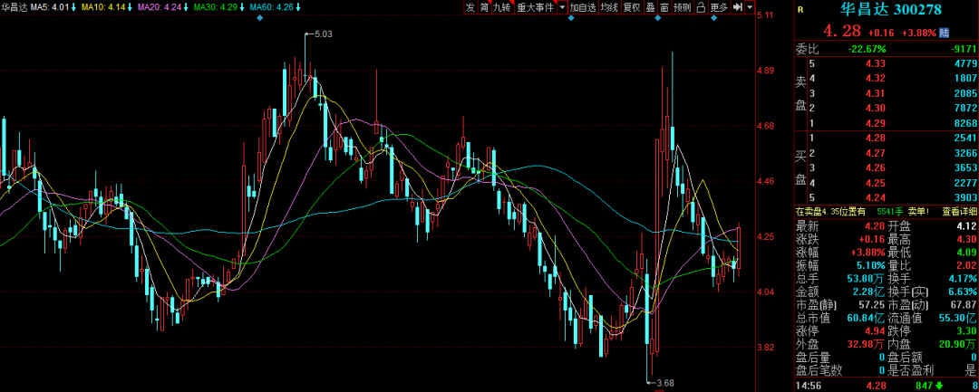 盘面上,截至今日收盘,华昌达报4.28元,涨3.88%。
