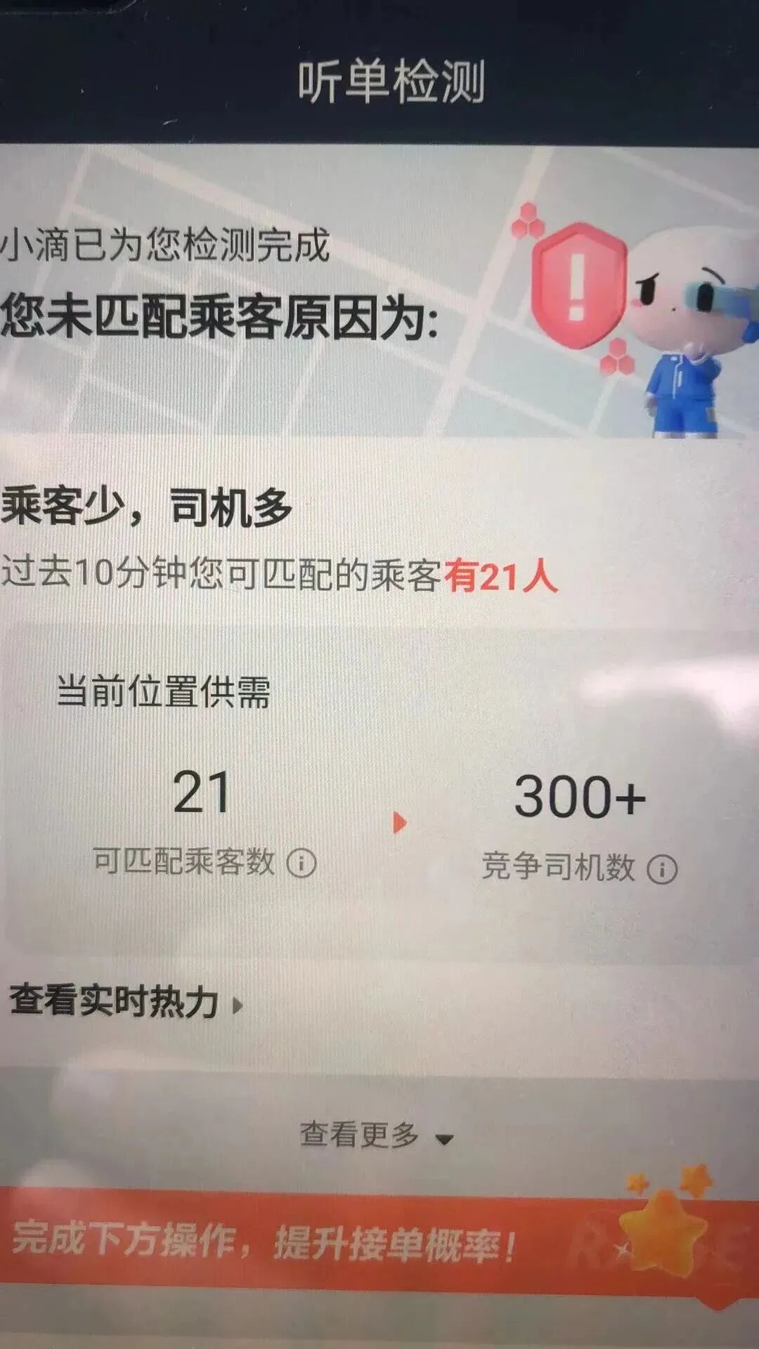 作为佛山滴滴网约车司机的车队分队队长,陈师傅跑单的同时还负责处理司机遇到的问题。陈师傅对第一财经记者表示,从和他其他司机的交流看,接单难不是个别情况。陈师傅提供了一张等待接单的页面,页面显示司机未能匹配乘客的原因为“乘客少,司机多。”过去10分钟该司机可匹配的乘客有21人,而竞争司机达到300多人。
