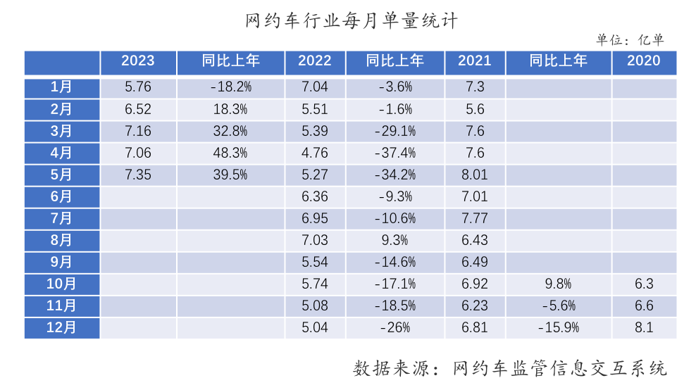 第一财经统计发现,从数据看,行业整体订单量正在恢复。网约车监管信息交互系统数据显示,今年5月平台共收到订单信息7.35亿单,相较于2022年5月的5.27亿单增长了39.5%。但是目前单量并未恢复完全,2023年5月的单量相较于2021年5月的8.01亿单下滑8.2%。