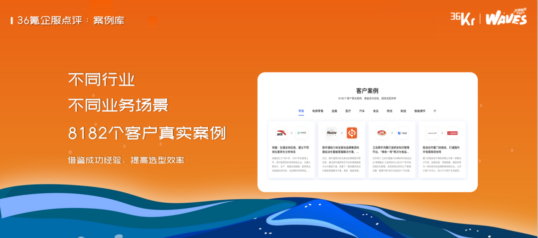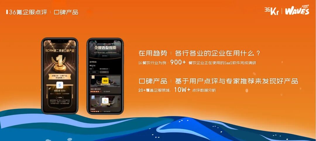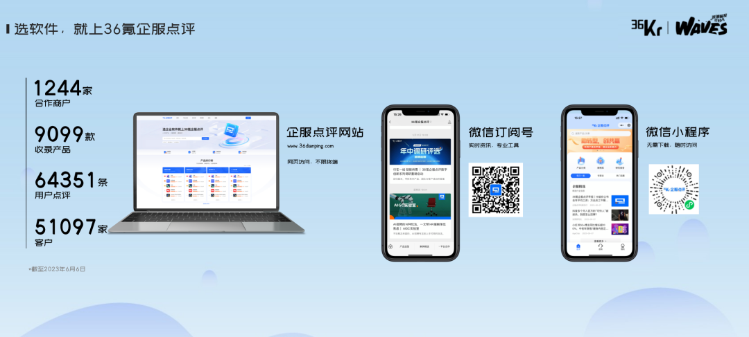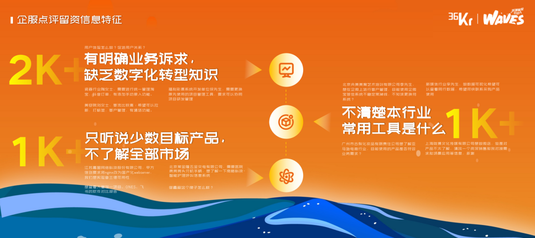 这两组数据说明了什么呢?说明仍然有很多好的赛道、好的企业被集中关注,这些赛道的出现,也不是一下子就出现的,而是持续了数年呈现一个慢慢增长到爆发的周期规律。那我们有没有办法提前预判,有没有办法及时跟进,有没有办法在身处其中的情况下,迎头赶上、超越对手?我认为这是所有创业者和投资人都关心的事情。我们围绕这个目的,36氪近期做了一些努力,希望真正能够帮助到大家,帮助到行业。这个图大家都很熟悉了,关键是如何跨越鸿沟。我们今天从行业的角度,给出的答案是,要善用外部活水,要提升内部效率。从外部活水的角度,36氪给到行业的方案是我们的创投平台。首先,行业信息和赛道的预判。36氪创投平台愿意、也有能力帮助大家先了解行业冷暖,帮助大家准确判断趋势。我们在创投平台上,收录了近300篇36氪研究院的原创研究报告,200多个精选项目集合,12万条公开披露实时更新的融资事件信息。通过这样的大数据和高质量的内容,我们基本上能做到,在第一时间预判出前沿赛道,在第一时间能够发布最受投资人关注的企业集合和赛道类别,真正帮助到大家提前预判和及时跟进。第二,在整体融资趋势下降的环境下,帮助到好的企业找到钱,是我们创投平台的使命之一。截止到本周的数据,我们创投平台上有3000多位一线投资人活跃,每周能够促成超过2000次的创投双端的建联,近半年有超过10000家企业,在我们创投平台上获得了资本的关注和后期的融资动作推进。我们期待、也有能力做成中国创新企业的首选融资对接平台。第三,创投平台也能够助力我们的企业品牌得到更好的全网曝光。我们希望成为企业的第二官网。我们看过一个数据,目前创投平台收录的硬科技类型的企业中,被媒体公开报道过的企业占比不足50%;当下,我们已经收录了超过20w+优质的创新企业,我们也帮助到这些企业,真正提升了他们的品牌在搜索引擎中的排名。同时,我们还在积极尝试做一些资源链接的事情,尤其是在上下游企业之间的资源对接,以及区域产业创新支持上,我们都在不断的探索和支持,希望真正能够把产业生态内的企业做到共生和增长。大家也可以扫码访问我们的服务,也可以在微信里关注我们的公众号,36氪创投平台。总结下来,36氪创投平台,我们当下收录了超过20w+企业,3千多一线活跃投资人,每周促成创投两端的精准对接数超过2000次;我们期望做成创新企业首选的融资平台。帮助我们的企业,预判趋势,链接资本,提升品牌力,真正把外部活水用起来。内部增效上,36氪给到行业的方案是36氪企服点评。真正提升内部效率,尤其是在AI技术快速普及和发展的情况下,唯一的道路就是数智化变革。数字化和数智化的必要性,我就不探讨了。但是具体到怎么做,行业内讨论的还是偏少。我今天主要从落地的角度,讲一讲我们的洞察。先给一个定义,数字化,就分为三个步骤,第一个是业务线上化,第二个是业务数字化,第三个是数字业务化。在这三个步骤里面,第一步就是怎么选择软件的问题。这一页是我们统计近期的36氪企服点评平台上,大概2000多个留资的信息。针对这些留资信息,我把它总结归类为了三类问题。第一类就是有明确的业务诉求,但是缺乏数字化转型知识。大家的诉求都是怎么做好我们的品牌,怎么扩大我们的客户规模,怎么提升我们的销量。但是不知道数字化如何转型,不了解有哪些产品、服务可以解决我们的问题。第二类就是大概知道一两款相关的软件,但是并不明确全部市场的情况,还有哪些软件能够帮助解决我们的问题。第三类就是不知道竞品在用什么,只知道竞品做的比我们好,但好在哪里,是团队,还是资本,还是内部的工具,他们在使用什么工具,使用结果如何,没有相应的案例。这是最直接的来自用户端的声音,当然这个行业包括决策路径本身,还有其他的核心痛点存在,但我就不展开讲了。我想分享的是,基于这些用户的声音,以及我们对行业的理解,我们近期做了哪些事情来帮助到大家,做好数字化转型的第一步。首先,口碑产品。企服平台收录了大概近10000款软件,每一个需要使用SaaS工具的企业,都需要对这一万款软件了解清楚吗?不需要,我们只要知道在这个赛道内,一个好的软件范围就可以了,这个范围可以是5款,也可以是10款,我们在这个范围内选择,基本都不会出错。所以,我们企服点评做了在用趋势和口碑产品。在用趋势,是各行各业当下正在使用的软件是什么,我们的数据来源来自两个部分,一个是各SaaS厂商的官网上公开展示的数据,一个是我们自己对企业的调研数据。以餐饮行业为例,我们调研了近千家餐饮企业,统计出来了不同业态下,SaaS工具的使用情况和在用趋势。如果你是一个餐饮老板,看完这个在用趋势,大概率就可以做出正确的决策。口碑产品,是我们基于我们的用户点评和专家推荐生成。这两个产品,都将在6月底正式推出上线,也欢迎大家积极参与进来。第二,案例库。我们目前收集汇总了大概8000多个案例,同时,我们的企服点评公众号下,还有一个专门的栏目,就叫三分钟案例精选。我们把整个案例讲的非常简单,就是甲方企业的痛点是什么,使用了什么工具来解决这个痛点,效果如何。就这三部分,三分钟肯定能读完,并且读完就能读懂。很简单的形式,但是有用且有效。第三,我们的专家团。我们当下基本汇聚了企服领域内知名