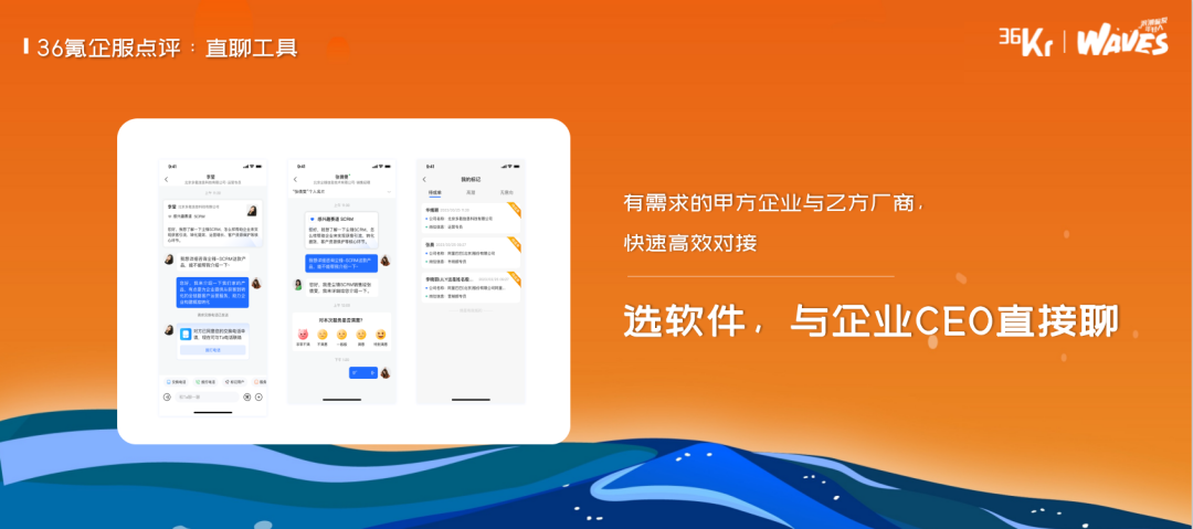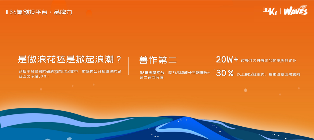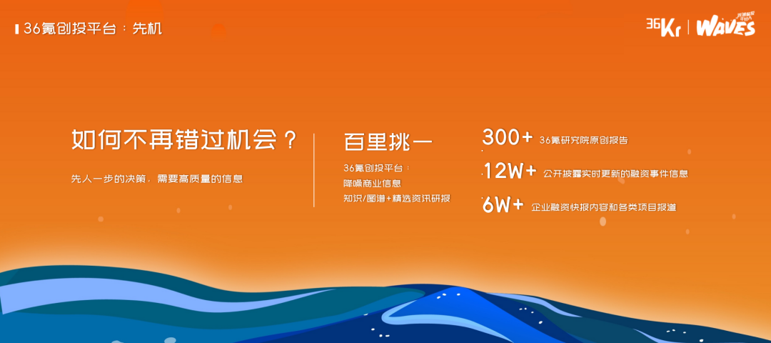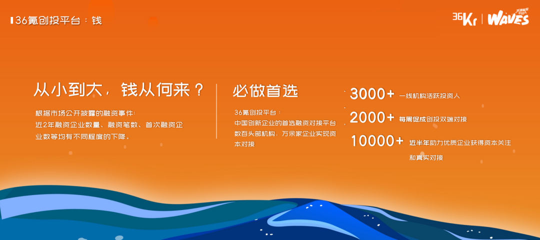 创新型企业亟需可持续发展动能。在2023年6月8日的36氪“WAVES”峰会上,36氪副总裁王坤从外部活水与内部增效的角度给出了“如何跨越创新鸿沟”的建议,并重点介绍了36氪创投平台和36氪企服点评所能提供的价值。来自36氪创投平台的数据显示,最近三年,企业融资事件、融资企业数量及融资金额上都呈现出下降之势,但这并不代表产业创新的速度已经放缓,在物联网、智能硬件、半导体、医疗健康、先进制造和前沿技术AI赛道,近3年整体的融资都呈现明显上涨之势。王坤认为,企业要在当下跨越创新鸿沟,需要撬动外部活水,同时提升内部效能,这分别对应了36氪创投平台和36氪企服点评所提供的价值。王坤介绍,36氪创投平台希望成为创新企业首选的融资平台,帮助企业预判机会、找钱、获得全网曝光以及对接产业资源。36氪企服点评则定位于帮助企业更高效“选软件”,平台提供在用趋势、口碑产品名册、案例库、专家团等功能,助力企业用数字化提升效率,此外,方便对接供需双方,“选软件,与企业CEO直接聊”的直聊工具也即将上线。大家好,我是36氪王坤,今天非常高兴能在这样的一个场合,跟大家分享一下我们36氪近期对产业的一些洞察,以及我们当下的一些做法和努力。也希望这些做法和努力,能够真正地帮助到我们在座的一线的创业者以及我们一线的投资人。我今天分享的主题是《生生不息之道,外部活水与内部增效》。首先我们先去看两组数据。这是来自于我们36kr创投平台统计的大概近5~6年的一个融资的数据的趋势变化。![]()