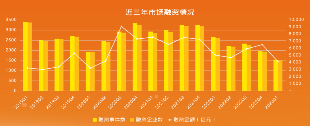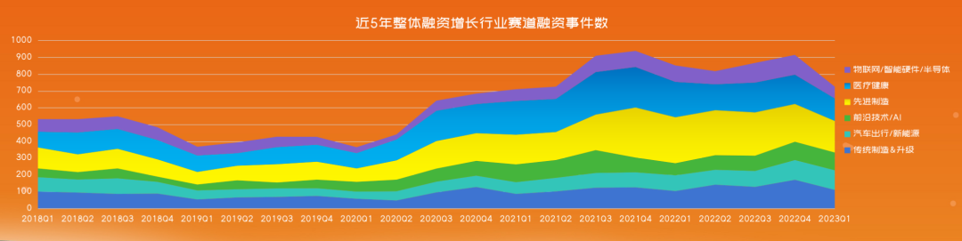 从第一张图我们能够清晰的看到,近三年整个市场的融资情况,不管是从我们的融资的事件数上,还是融资的企业数量,以及融资金额上都呈现了一个下降的一个趋势。近两年尤其是22年Q4和23年Q1,这种下降的趋势更为明显。那我们在首次融资的企业数上,看第二张图,这个数据从18年之后就开始呈现了一个下降的趋势。那这样的一个数据走势,就说明了我们的整个创新是在放缓的吗?我们又统计了另外的一个数据。我们发现,在一些赛道上,尤其是物联网、智能硬件、半导体、医疗健康、先进制造和前沿技术,包括最近大火的AI赛道,近5年整体的融资趋势,都呈现了一个持续上涨的状态。![]()