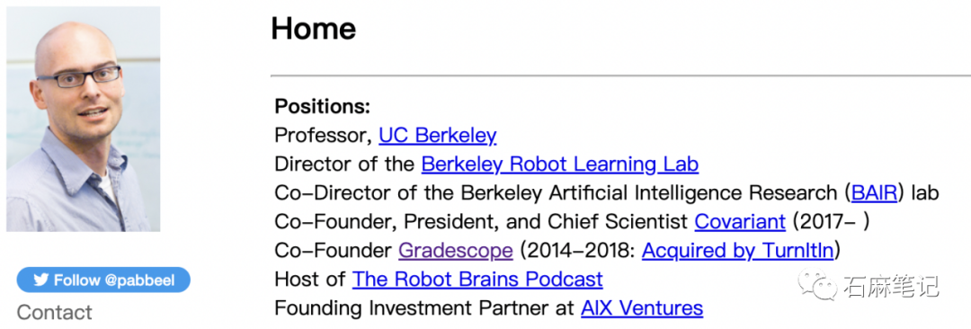 张天浩(Tianhao Zhang,研究科学家,左一),段岩(Rocky Duan,CTO,左二),陈曦(Peter Chen,CEO,右二), 皮特·阿贝尔(Pieter Abbeel,右一)。他们四人中有三人曾经在OpenAI工作过,Ricky Duan、Pieter Abbeel和Peter Chen在创立Covariant之前,都在OpenAI做研究科学家。OpenAI在2021年解散了机器人团队,把资源集中在更容易获取数据的大语言模型领域。与之形成对比,Covariant则是倾注全部精力和资源将机器人从实验室带到现实世界中,让机器人在真实的工作场景学习和训练。Covariant的训练数据通过机器人与现实世界的交互获得,数据门槛更高,比竞争对手也有更大的领跑优势。Pieter Abbeel是Covariant的核心人物,他是将深度强化学习应用在机器人方面的先驱人物,于2021年获得ACM 计算奖的荣誉。在获奖公告中,ACM 提到:「Pieter率先教会机器人从人类演示中学习(学徒学习)和通过自己的反复试错学习(强化学习),这为下一代机器人技术奠定了基础。」(Source:https://people.eecs.berkeley.edu/~pabbeel/)Pieter于1977年出生在比利时安特卫普,2000年获得比利时鲁汶大学电气工程学士和硕士学位,并在斯坦福大学获得计算机科学博士学位。最初,他打算攻读计算机科学硕士学位,但由于斯坦福大学进行了大量的人工智能项目,他决定留下攻读博士学位。他是AI大牛吴恩达的第一个博士生。在2008年完成博士学位后,Pieter成为伯克利大学电气工程与计算机科学系的助理教授。Pieter Abbeel现为加州大学伯克利分校计算机科学与电气工程教授,伯克利机器人学习实验室主任、伯克利人工智能研究(BAIR)实验室的联合主任,他最出名的是在机器人和机器学习方面的前沿研究,特别是在深度强化学习(deep reinforcement learning)方面。他的实验室还推动了深度模仿学习(deep imitation learning),深度无监督学习(deep unsupervised learning),迁移学习(transfer learning),元学习(meta-learning)和学习学习(learning to learn)的前沿,还研究了人工智能如何推进其他科学和工程学科的发展。除了科研之外,Abbeel还以联合创始人的身份创立了两家公司,covariant.ai和Gradescope(一个线上评分系统,目前被全球500多家大学使用)。在2021年,他加入了AIX Ventures作为投资合伙人。AIX Ventures是一家投资于人工智能初创公司的VC。此外,他还主持了每周播客Robot Brains,采访很多AI领域的科学家、创业者和投资人。在一段Covariant CEO Peter Chen的采访中,他讲述了Covariant的创业故事: