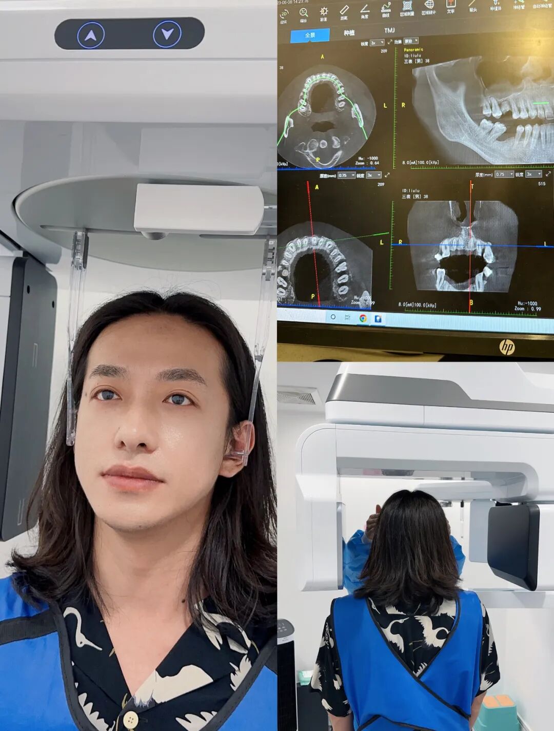 穿上特殊装备,在医助协同下。开始口腔全景、侧位:CT检查。可以了解牙齿与口腔的现状,例如智齿排布情况,牙龈健康状况。