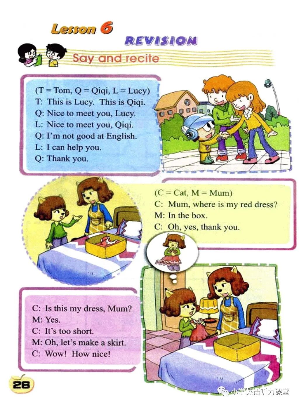 Lesson 6 REVISION 第6课 复习Say and recite说一说,背一背。 T stands for Tom. T代表汤姆。 Q stands for Qiqi. Q代表齐齐。 L stands for Lcyy.L代表露西。 This is Lucy. This is Qiqi.这是露西。这是齐齐。Nice to meet you, Lucy.很高兴见到你,露西。Nice to meet you, Qiqi.很高兴见到你,齐齐。I'm not good at English.我的英语学得不好。I can help you.我能帮助你。Thank you.谢谢你。Mum, where is my red dress?妈妈,我的红色连衣裙在哪里?In the box.在盒子里。Oh, yes, thank you.噢,对,谢谢您。Is this my dress, Mum?这是我的连衣裙吗,妈妈?Yes.是的。It's too short.它太短了。Oh, let's make a skirt.噢,我们来做条短裙吧。Wow! How nice!哇哦!真漂亮!