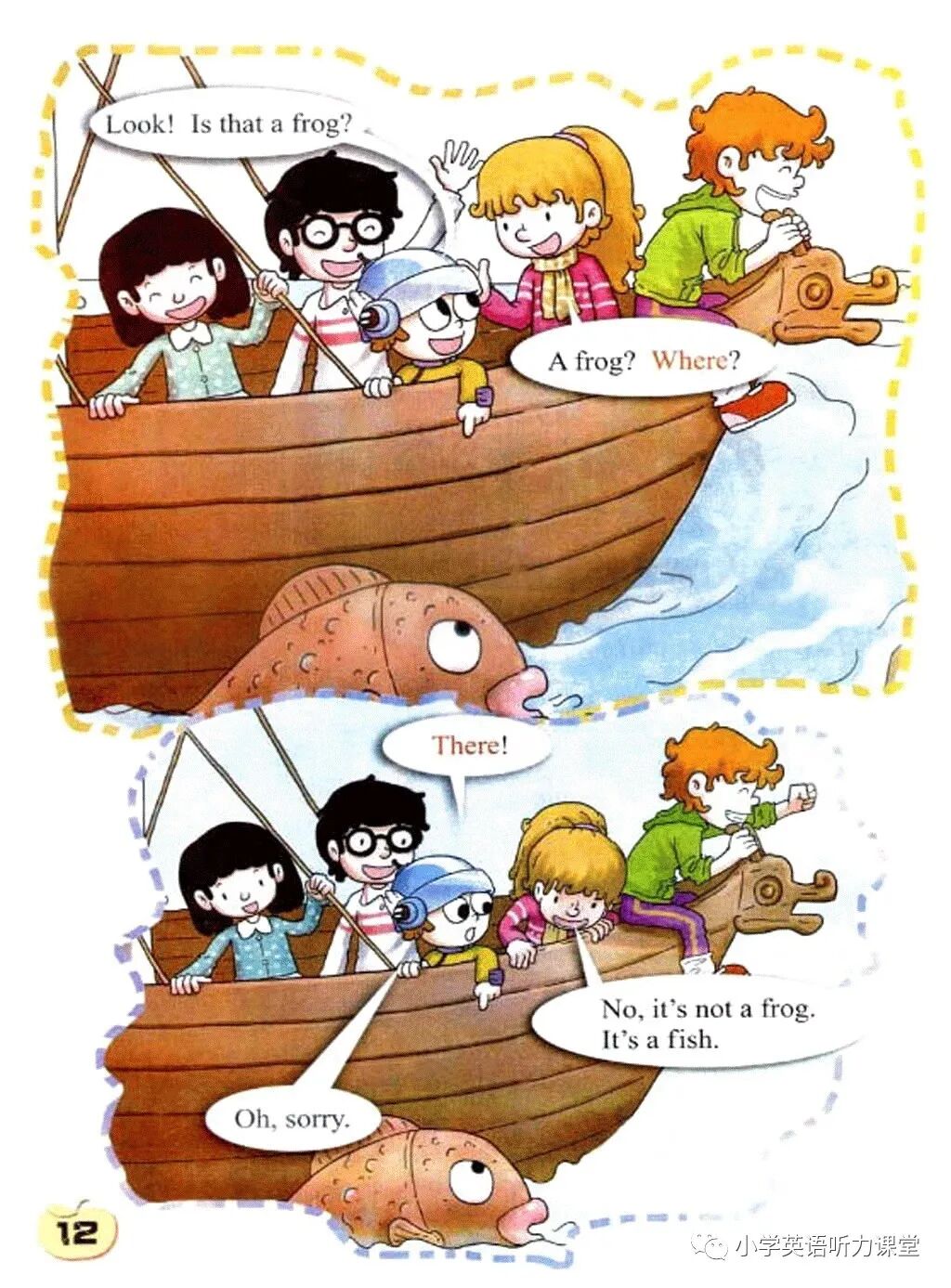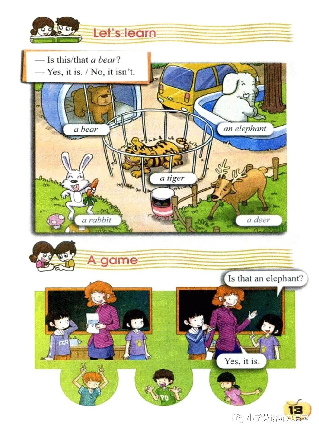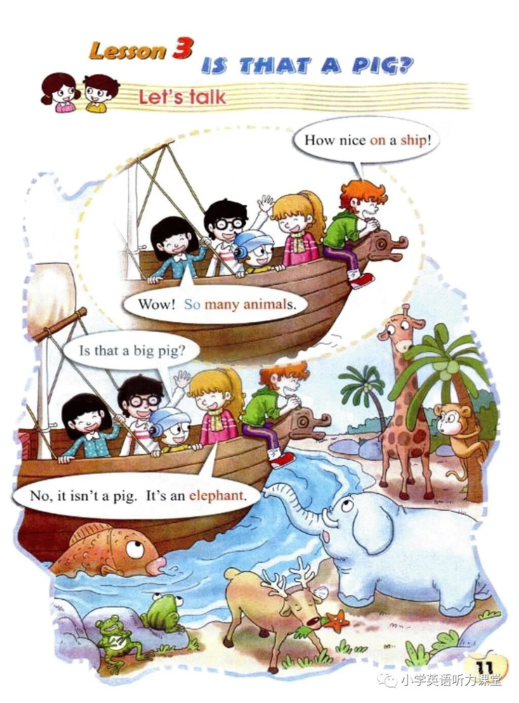 Lesson 3 Is That A Pig? 第3课 那是一头猪吗?Let's talk说一说How nice on a ship!坐轮船真好玩!Wow! So many animals.哇哦!这么多的动物啊!Is that a big pig?那是一头大猪吗?No, it isn't a pig.不,它不是猪。It's an elephant.它是一头大象。Look! Is that a frog?快看!那是一只青蛙吗?A frog? Where?青蛙?哪儿?There!在那儿!No, it's not a frog.不,它不是一只青蛙。It's a fish.它是一条鱼。Oh, sorry.噢,对不起。Let's learn学一学Is this a bear?这是一头熊吗?Is that a bear?那是一头熊吗?Yes, it is.是的,它是熊。No, it ish't.不,它不是。a bear 一头熊an elephant 一头大象a tiger 一只老虎a rabbit 一只兔子a deer一头鹿A game游戏Is that an elephant?Yes, it is.那是大象吗?是的。