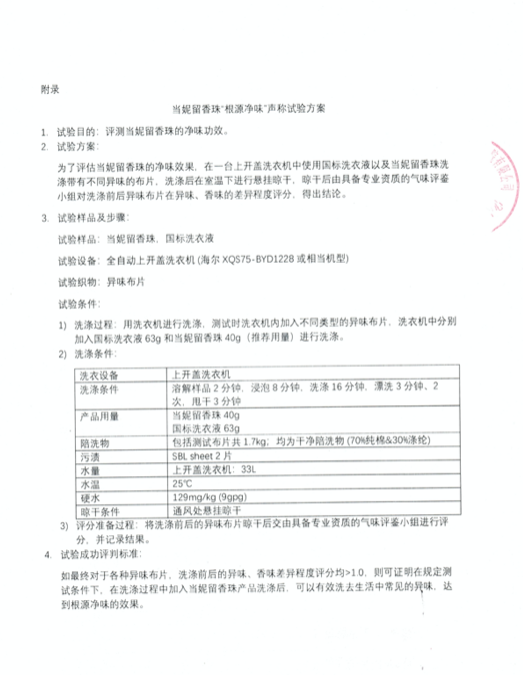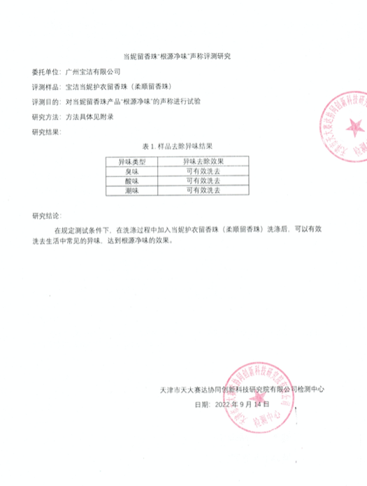 据当妮留香珠「根源净味」声称评测研究结果显示,在实验条件下,可有效洗去臭味、酸味、潮味*!(*实验过程详见下图)