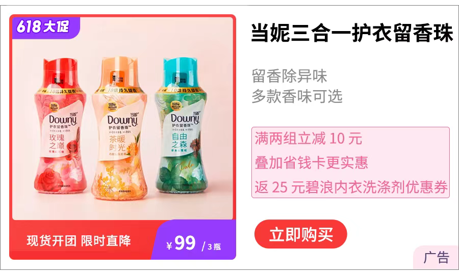 当妮留香珠可谓是一瓶多用,买到就是赚到!现在 618 活动价,3 瓶只要 99 元,满两组立减 10 元,还可叠加省钱卡!再给大家返一张 25 元的碧浪内衣洗涤剂优惠券。
