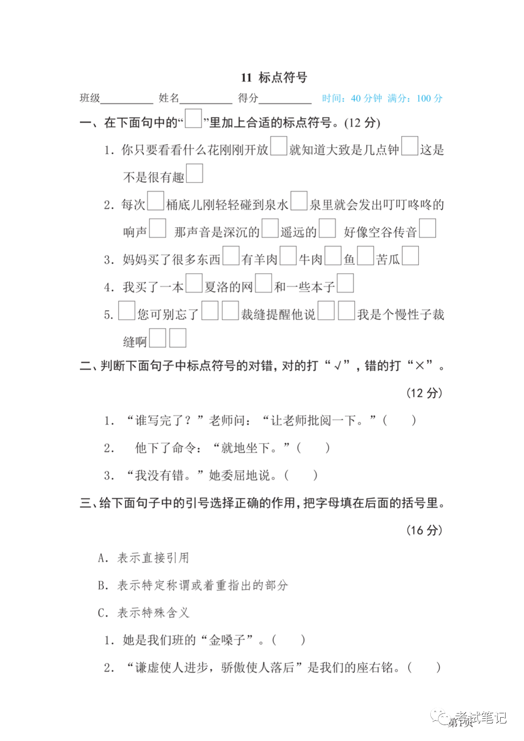 三年级语文:标点符号专项训练,不会用标点符号的可以拿着练练,本套习题有答案,可以自查对错!