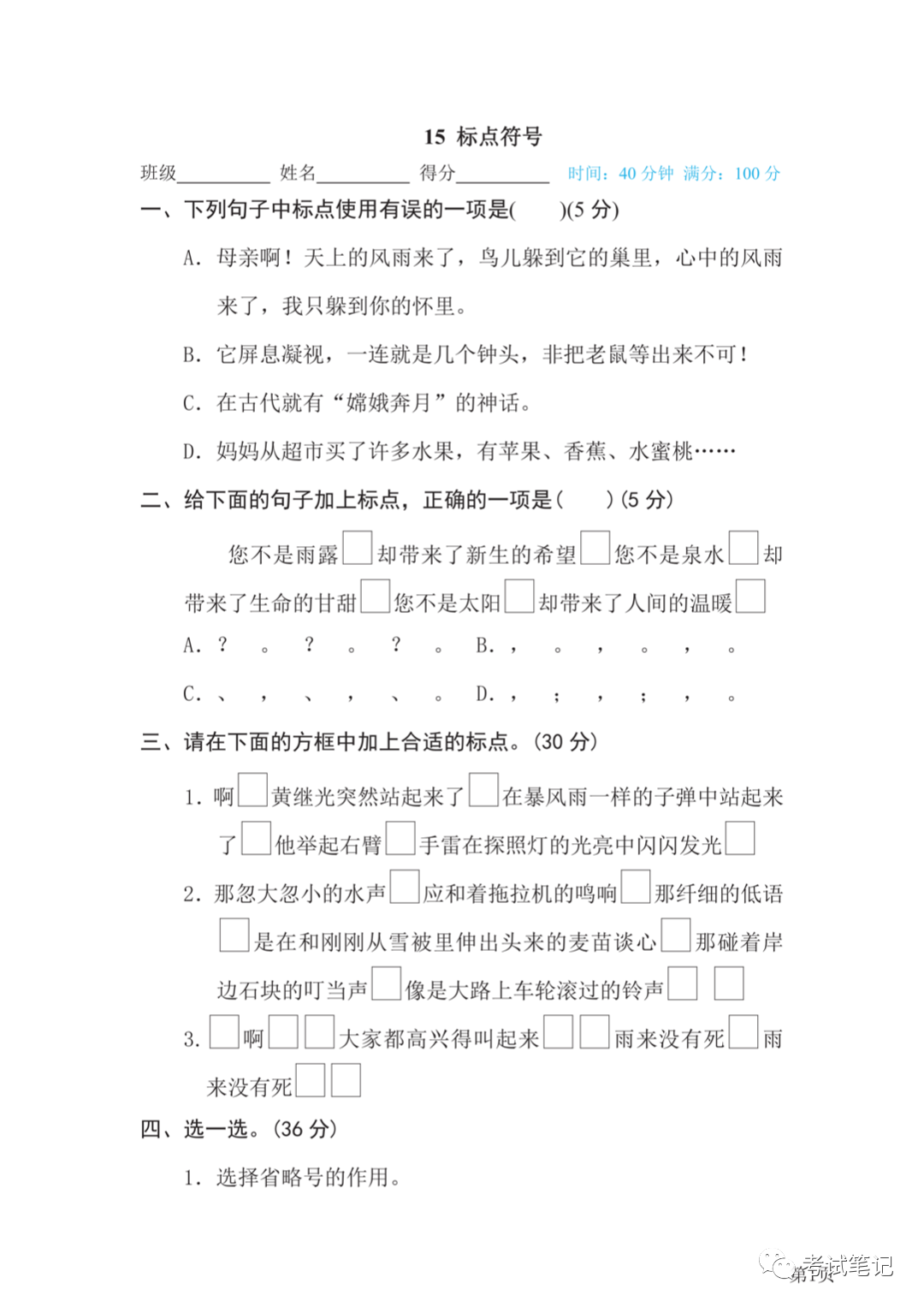 四年级语文:标点符号专项训练,不会用标点符号的可以拿着练练,本套习题有答案,可以自查对错!