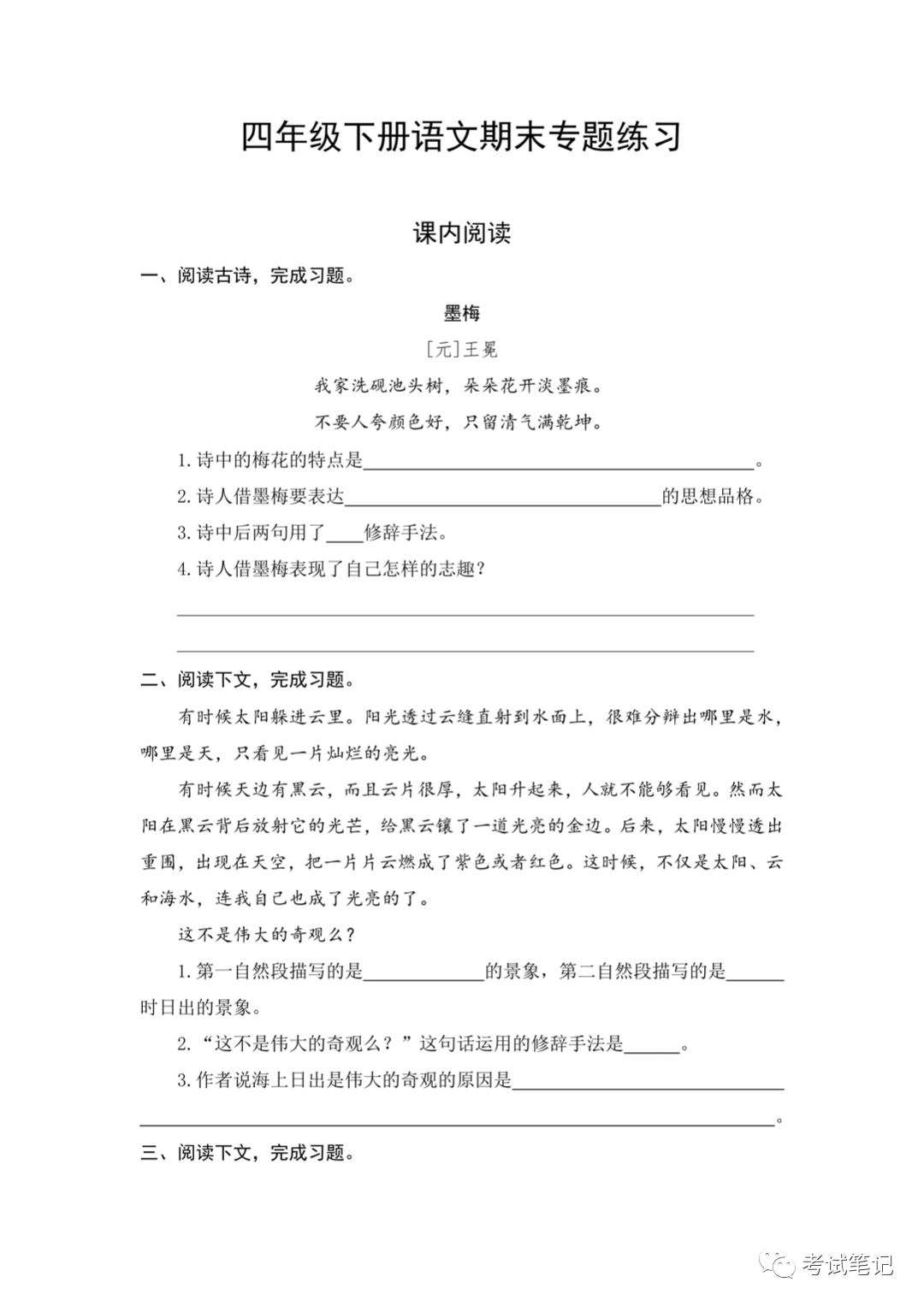 四年级语文下册:期末专题练习,课内阅读!