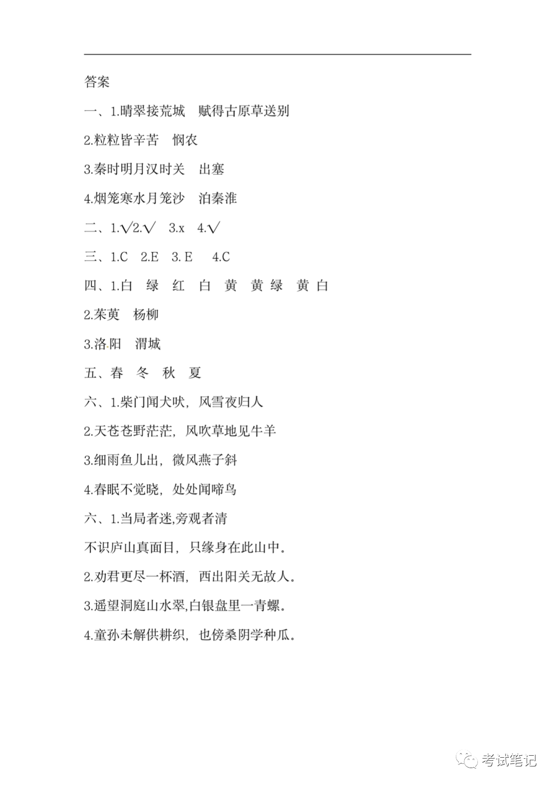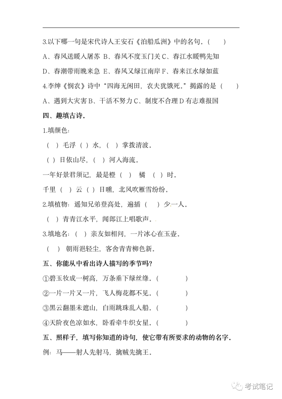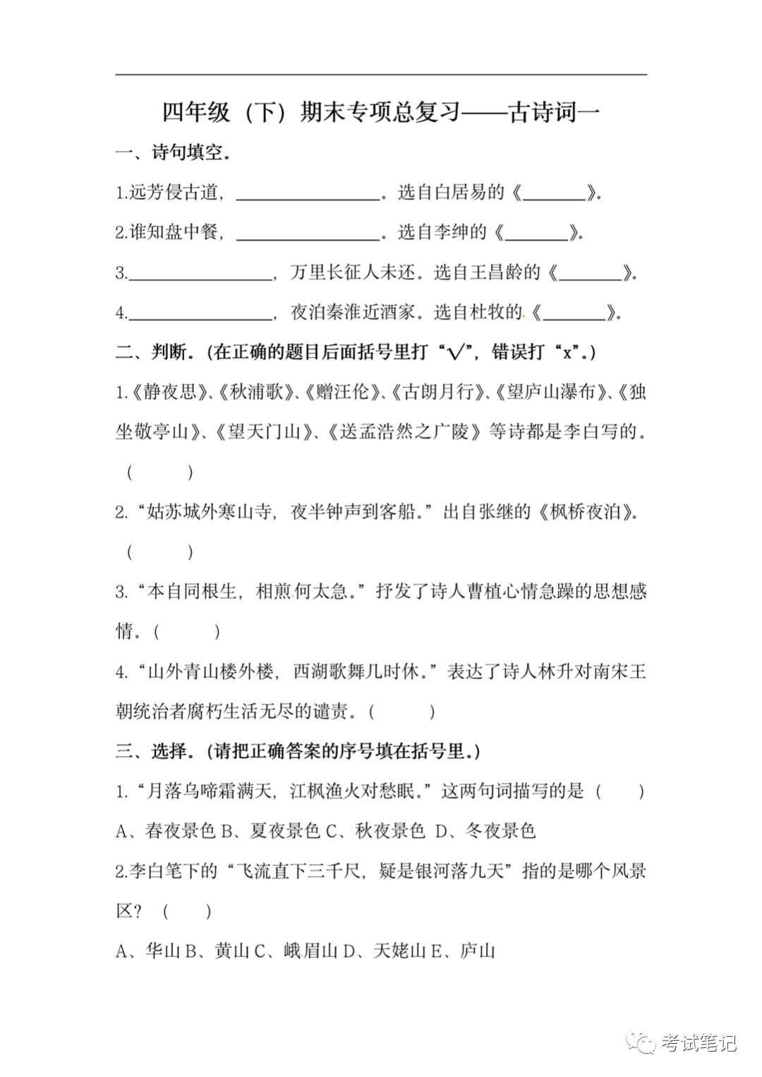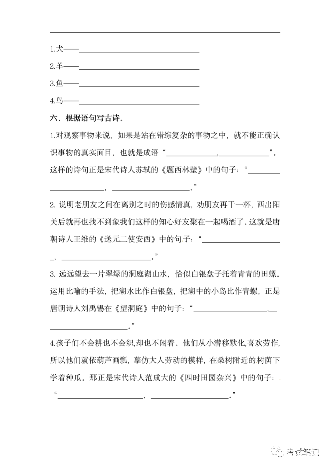 四年级语文下册:古诗词训练,期末专项练习题!
