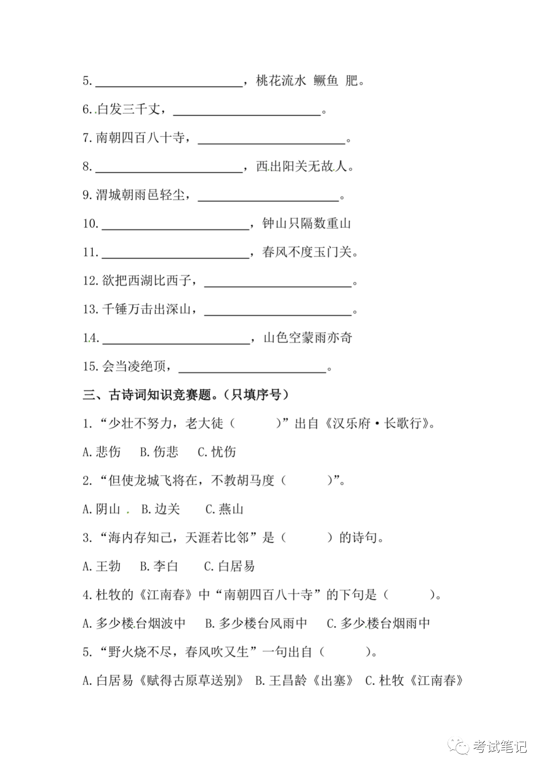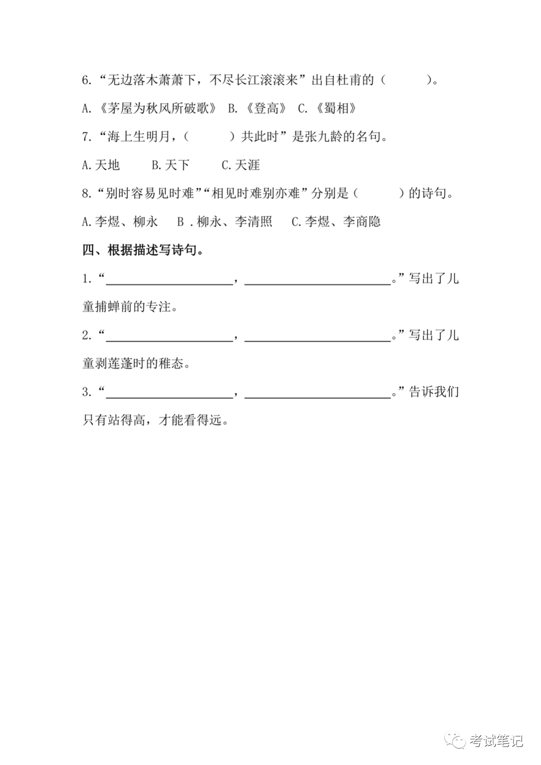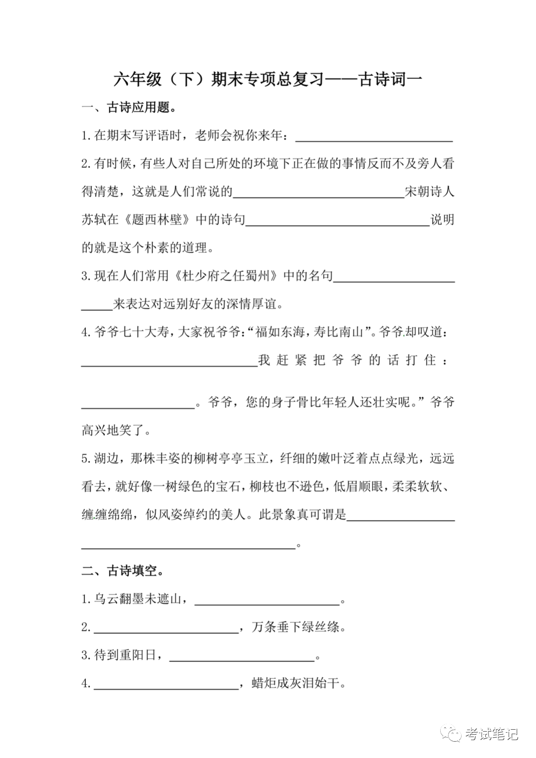 六年级语文下册:古诗词训练,期末专项练习题!