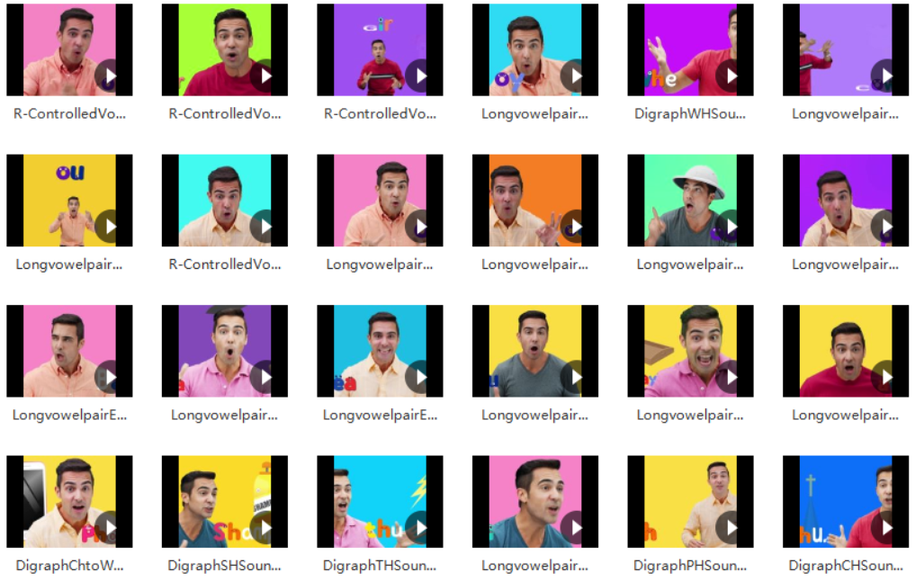 Hello Carrie不仅给字母组合发音教学补上短板,还细致的将自然拼读字母组合教学儿歌视频,分为Diphthongs双元音、Digraphs混合辅音以及R-controlled vowels字母R组合音三个大类,足足24首!真的太走心了~其中包含有: