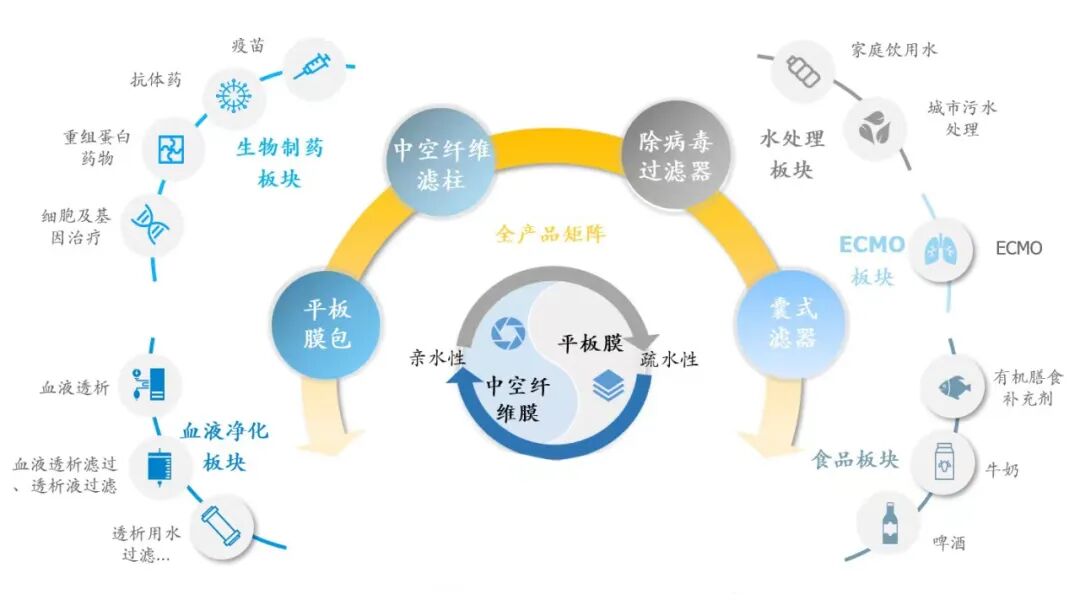 其膜产品覆盖基因治疗、疫苗生产、抗体药等生物制药领域,以及血液净化(成熟)市场和ECMO(新兴)市场,同时覆盖水处理市场和食品医疗的过滤耗材市场。 |
