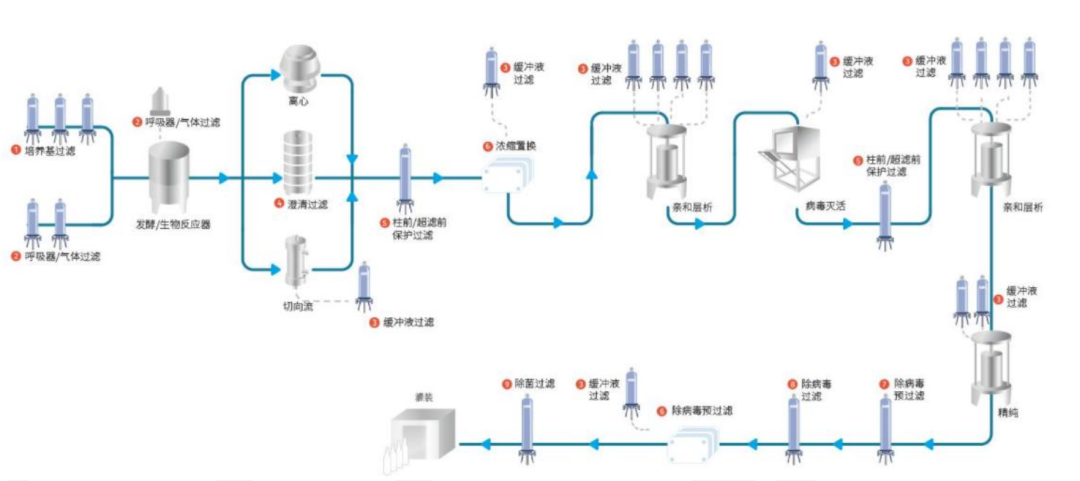 以单抗生产为例,膜过滤技术在抗体药物生产工艺中是不可缺少的环节,被广泛地应用在培养基、缓冲液和蛋白原液的除菌过滤,培养基下罐后快速的细胞与上清液的分离以及发酵过程的气体过滤中。![]()