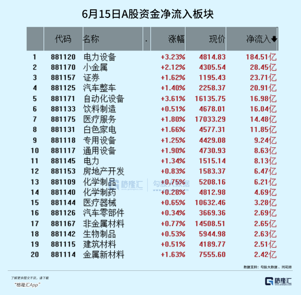 一方面,今天净流入最大规模的是,新能源、医疗、消费、电力、制造业和房地产等板块。