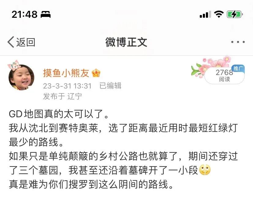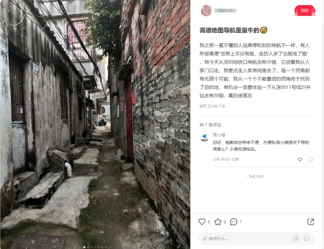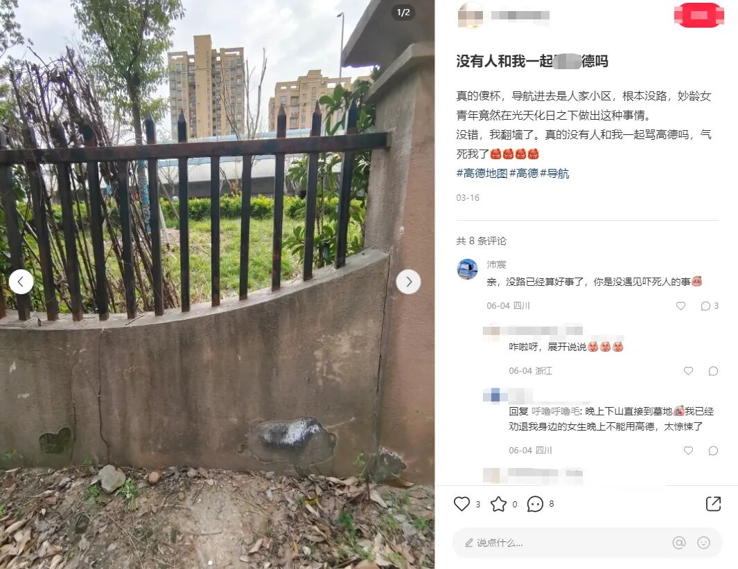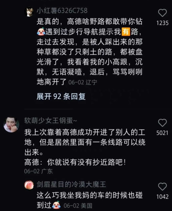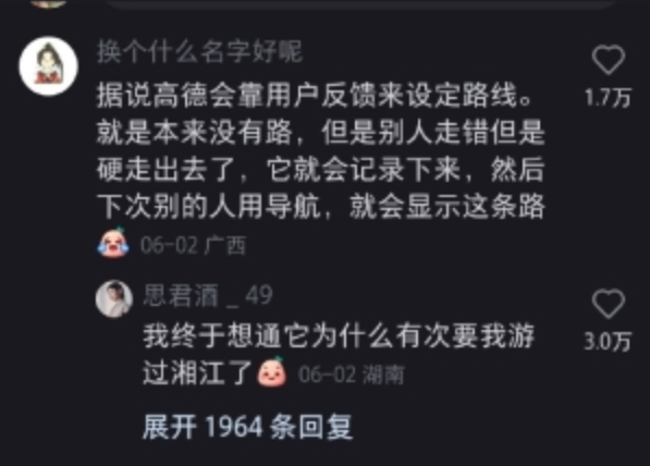 这产品经理一拍大腿,鲁迅先生说的对啊,有人走的地方那肯定就是路啊,没路也被走成了路,我何必要自己辛辛苦苦钻小路去测量,直接收集用户行动轨迹不就自动把路探测出来了么,人又不会飞,难不成有人走的地方还不是路?从此高德地图多了项功能,就是根据采集到的用户数据自动识别新道路。原理简单的说是这样的,如果有人开着高德地图软件在高德后台数据库里显示空白的地方行走,那系统就会自动把这个人移动的路线标注为疑似道路,然后根据这个人前后一段时间的行动速度判断其到底是行人还是拥有自行车或者汽车等载具,最后定出道路等级。有了这条疑似道路后,如果周围有人使用高德地图导航,那高德地图就会试探性的把这条刚出现在后台数据库的新路推荐给一些人,比如十个二十个。如果这些人里面有人按照疑似道路的轨迹走过去了,那系统就会认定这是条真实路线,会推荐给更多的高德用户,然后根据更多用户的数据反馈来完善这条路的资料,比如通过速度,消耗时间等。这个新设定让高德地图在极短的时间内搜集到了大量的小路和野路的数据,让很多野外地区不再是导航地图的空白,给高德地图带来了无数好评,以及无数吐槽。其中吐槽的数量远远多于好评,甚至在各大网站引发出了热门话题,我看了之后差点被笑死,觉得有分享给大家的必要,就把那些网友的吐槽搜集起来给大家集中展示下。有人说自己在乡野小路开着高德骑自行车,结果高德指引他到了河边,然后要求他从一条直径1米左右的采暖管线那里过河。他没办法,只能扛着车过去了,然后上网吐槽说高德地图太狠了。为什么高德地图非要那么狠,让这个人从采暖管线过河?因为更狠的其实是这个扛着车过河的用户,正是这样的狠人多了才让高德软件误以为这其实是条路。如果人人都拒绝从这个采暖管线过河,时间长了系统就会自动把这条路废弃掉。但只要有人扛着车过了河,那就说明这条路是走得通的,扛车过河的人越多那系统就认为这条路的质量越好。还好吧,直径1米多的采暖管线呢,其实还挺宽敞的,换我其实我也敢过。有些高德用户蹚出来的路简直就吓死人,比如高德地图曾经显示一根钢绳为道路,要求用户走过去。别问为什么软件会显示这根钢绳为道路,那肯定是有人走通过才会被后台记录下来的。然后你就可以理解为什么高德地图引发了这么多的吐槽。下面这个是高德显示的人行道,是有点奇葩,但人难道走不过去么?草都被人踩平了好嘛,按鲁迅先生的标准这是典型的道路。下面这个是高德给的自行车道导航用户吐槽图,但这个吐槽就更没道理了,这难道不是标准的自行车道么,难道不能骑自行车?典型城里人,太矫情了,农村人多年来都是在这种路上骑自行车的,这路况开摩托车都不是问题。下面这个是高德给汽车导航的道路,有用户说高德地图让他开车从高铁桥下的河里过,他咬咬牙信了高德,结果在水里面转了几个弯,上岸了!我大概猜测一下,他过的应该是高铁桥下的涵洞,积了十几公分的水就会看起来好像是条河,但车开过去是没问题的。下面这张图如果地面积个十几公分的水,大概就会变成上面那个吐槽用户所说的场景,是有点阴森恐怖和吓人,但过确实还是能过的。但这种导航原理在很多时候都是前人开路后人骂娘,因为不是每个人都想走那么奇葩的路。还有城市里的一些栅栏啊,围墙啊,有些有破损可以被人钻过,次数一多就被高德地图标记为了道路,然后推荐给了其他人。但不是每个人都想为了自由而钻狗洞的,前面确实有很多人钻狗洞过去了但这不代表后面的人也想钻狗洞。还有一位妙龄女青年,被高德导航到了别人小区里,和目的地之间隔了一条铁栅栏,实在不想走回头路了咬咬牙翻墙而过。每个被导航而来然后翻墙的人,都会导致更多的人被指引来这里。这位女生自己都选择了翻墙而过,那就自然可以解释为什么软件会指引她从这里走。当然,这也不影响该妙龄女青年用户回家后开贴怒喷高德,人类和智能软件都有各自的道理。极端一点,如果有高德用户开着软件带着手机游过了湘江,那就会直接导致别的用户也被提示这里有路,要求你也跟着游过湘江,被其他用户全部拒绝后才会取消这一路线。但凡有人跟着游过去了,那就会立即导致更大规模的用户被推荐这一路线游过湘江。甚至如果曾经有人从桥上跳下去,成功把这条路走通了,那也会被显示为一条路径,要求你也跟着从桥上跳下去。前面那位妙龄女青年的帖子里有人说高德喜欢让人走墓地,这个倒是真的,因为墓地周围的路一般不堵,耗时最短。如果你喜欢选用时最短的路,而周围恰好有墓地,那高德一定会把你导到墓地去,连穿3个墓地都是小事。当然除了吐槽之外,很多用户也给了高德好评,毕竟还是有很多用户更倾向于节约时间。只要你能节约时间,那哪怕再奇葩的路,他们也给好评。高德带你走的路可能很黑,可能很险峻,但只要高德说能省时间,那就真的可以省时间,不会骗你。还有高德这种爱钻野路的性格,摊在城市里可能会让你翻墙钻狗洞,可能会让你从各种难以置信的小胡同里钻来钻去。但如果你在荒郊野岭里迷路了,那这爱钻野路的性格是可以救命的,高德曾经因此收获一个死忠粉。高德显示的一条汽车道路需要从别人院子里穿过去,还需要院子的主人把桌子抬走才能 让汽车通行。但高德提供了这