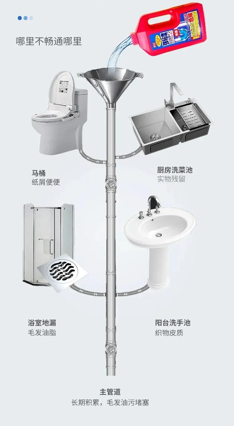 别急!其实疏通管道没那么麻烦,只要一瓶有效的管道疏通剂,一倒,一冲,就完事儿了!