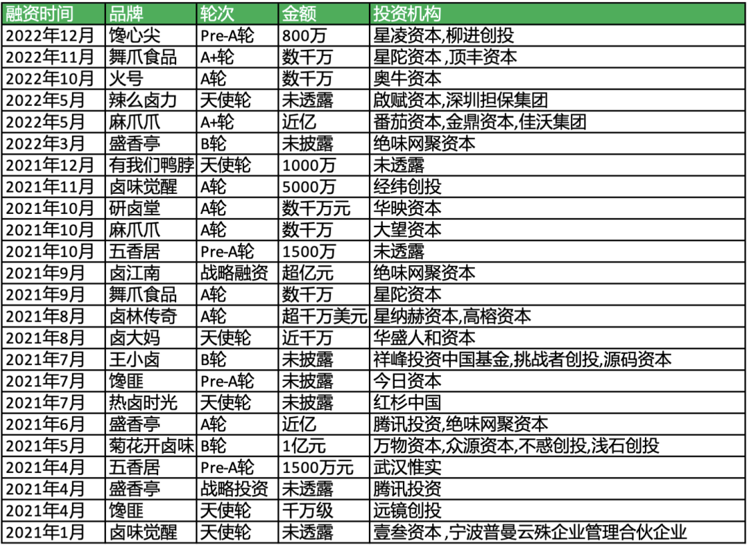 卤味赛道融资情况,36氪据天眼查不完全统计其中,风头最盛的现制热卤品牌“盛香亭”,获得来自腾讯、绝味的近亿元A轮融资。卤味零食品牌“王小卤”,仅三年销售额就达到10亿元。三只松鼠、良品铺子等,也在卤味赛道有所布局。在这一过程中,三巨头也在积极求变,不断推出子品牌、或是“鸭货”外的新品类。但从当下的市场反馈看,无论是周黑鸭的“小龙虾虾球”,还是绝味的“爱鸭匠”,声量依旧平平。此外值得提及的是,绝味食品也在通过资本手段布局第二曲线。据统计,绝味旗下网聚资本已投资十余家企业,包括廖记棒棒鸡、盛香亭、阿满百香鸡、颜家辣酱鸭、精武鸭脖等多个品牌。今年3月,绝味又抛出港股上市计划,并表示将“加快公司的国际化战略,增强公司的境外融资能力”。相信在未来,卤味市场的竞争会更加激烈。且在净利润下滑、增长放缓的情况下,“三巨头”仍计划加速开店。其中,煌上煌预计2023年新开门店2000家,门店将集中于临街店铺和商业综合体。周黑鸭也表示将在今年新开1000家门店,同时会优化单店模型,聚焦“小而美”的模式。![]()