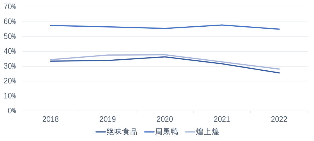 “顶风”开店,下沉不是唯一解消费不振、成本上涨,确是卤味行业面临的现实困境。但拉长时间线,疫情只是问题的催化剂,“内忧”早已显现,至少周黑鸭如是。在2016年上市之初,周黑鸭凭借高端化的形象提升估值,毛利率也一直保持在50%以上。相较之下,绝味与煌上煌的毛利率仅34%左右。然而,周黑鸭的“高端路线” 并没有越走越宽,其归母净利润在2017年达到顶峰后开始逐年下滑。面对“下坡路”,连锁企业的应对法门不是涨价就是开店。很长一段时间内,周黑鸭与绝味的开店模式都是两种路径。公开资料显示,自2016年上市至2019年,周黑鸭始终以直营为主,门店位置也多集中于机场、高铁站等场所。不过卤味毕竟是“小生意”,高端场景的消费频次低、直营模式的扩张速度慢。与周黑鸭相比,主打加盟、围绕在社区附近的绝味,烟火气更足、扩张速度一骑绝尘。2019年,周黑鸭终于开启特许加盟模式,逐步进军社区及下沉市场。巨头们的竞争随即进入白热化。且这样的“大跨步进攻”并没有因为疫情而放缓。