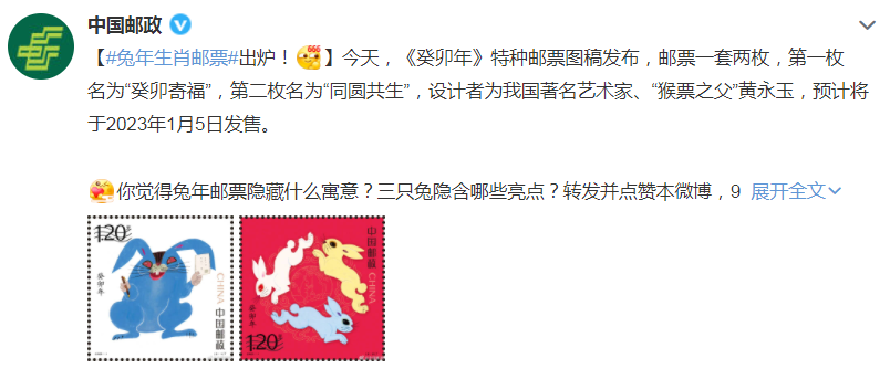 就在年初,中国邮政发布2023年兔年生肖邮票,藏家圈都预测是黄永玉最后的绝唱,没想到如今一语成谶。当时生肖邮票图稿在中国邮政发布会亮相,连名人届都沸腾了!探月工程首席科学家欧阳自远、航天英雄杨利伟、著名艺术家韩美林、著名画家姚钟华纷纷为他打call~因为设计它的人是中国画坛鬼才,也是中国生肖邮票开山之人,被称为“猴票之父”的——黄永玉。2017年,他创作的80版猴票在保利拍卖会上,拍出201万元的记录,创下中国现代邮票拍卖传奇。一版80枚,面值8分钱的猴票,在三十多年后身价翻倍,让人惊叹!这枚邮票被誉为“生肖票之魁”——,也称“金猴票”。不少人疑惑,一枚小小的邮票,为何能在收藏界掀起如此“风暴”?猴票能有如此这般不菲身价,也许能在黄永玉的艺术身价中略窥一二。80年代,他的单幅作品《湘荷在水镜心》,拍价已达到483万。到了20世纪,黄永玉大师的作品一平尺的均价,在市场上达到150-180万之间,收藏潜力巨大!他创作的80版猴票,随他身价的飙升而水涨船高,也是情理之中的事情。在2023年来临之际,这版兔年生肖邮票将是年近99岁黄永玉老先生的封山之作,自然非同凡响!很可能会再现收藏界的神话!2023年1月5日,由黄永玉老师创作的《癸卯年》生肖邮票将正式发行,将是万众期待!可以预想到这将是,一个千人抢万人等爆热邮票。我们贴心为大家争取到预售名额,不用抢破头,在家就能等到《癸卯年》生肖邮票大版票!现在预定,额外赠送2023兔年贺年生肖专用邮票小全张、 贺年明信片及兔年首日封,全都是受欢迎的纪念品,中国邮政官方发行,抢都抢不到!其中赠送的兔年首日封非常难得!它是在邮票发行首日贴用该种邮票,并盖首日普通邮戳或纪念邮戳的信封,非常稀少和昂贵!很多人想买都买不到‼️一套《癸卯年》生肖邮票(2张大版张)+2023兔年新年贺卡+小全张+兔年首日封,仅500名额,限量发行!赠送2023兔年新年贺卡+小全张+兔年首日封