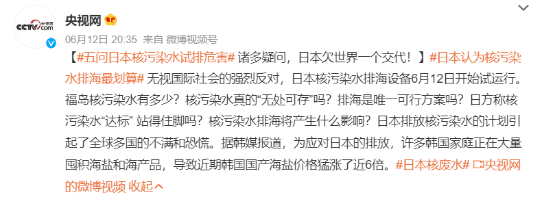 6月12日,据央视报道,日本无视全世界的反对,执意开启了核污水排海设备的试运行,全人类就此被日本推向无尽的深渊。