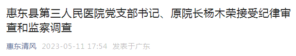 5月11日,惠东县纪委监委官方微信“惠东清风”发布消息,惠东县第三人民医院党支部书记、原院长杨木荣涉嫌严重违纪违法被查。