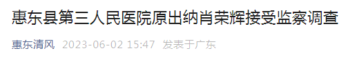 惠东县纪委监委官方微信“惠东清风”6月2日发布消息称,惠东县第三人民医院原出纳肖荣辉涉嫌严重违法,目前正接受惠东县监委监察调查。