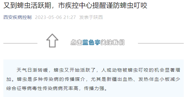 记者注意到,就在今年5月,西安市疾病控制中心提醒大家,又到蜱虫活跃期,外出要谨防蜱虫叮咬。