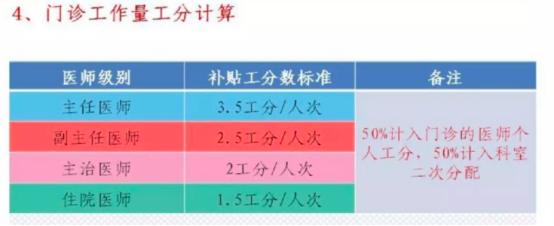 主要综合考虑各科室的责任负担、工作强度等,按照不同的岗位、不同的公分数来考核,比如医生的职称、工龄、手术所需人数、门诊所需医生人数、住院工作量等。不同职称等级的医师目标年薪在11万元~30万元不等。