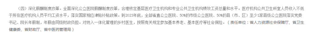 此外,《通知》还明确,在今年年底,全部的省直公立医院、50%的市级公立医院、50%的县(市、区)至少1家县级公立医院落实党委书记、院长年薪制,年薪由同级财政负担。
