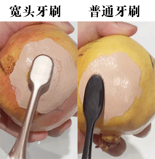 将石榴上涂满很难清洗的粉底,左宽头刷,右边传统牙刷,肉眼可见清洁效果比右边好很多,而且清洁面积大很多。![]()
