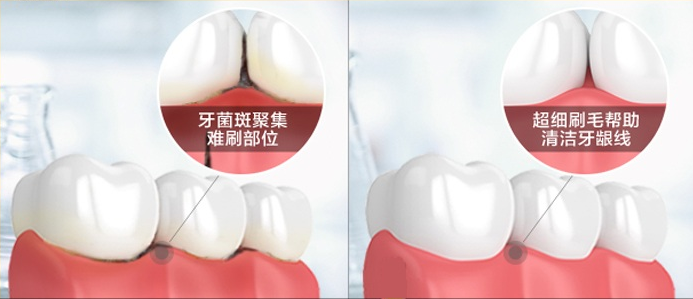 每根刷毛大概0.18mm,中间刷毛偏硬些,外圈韧性更强,尖头比头发丝还要细很多,可以深入到牙齿细小的缝隙里,隐藏在牙缝里的残渣很轻松就能刷出来。护龈清洁一步到位,有效清除牙缝残渣。![]()