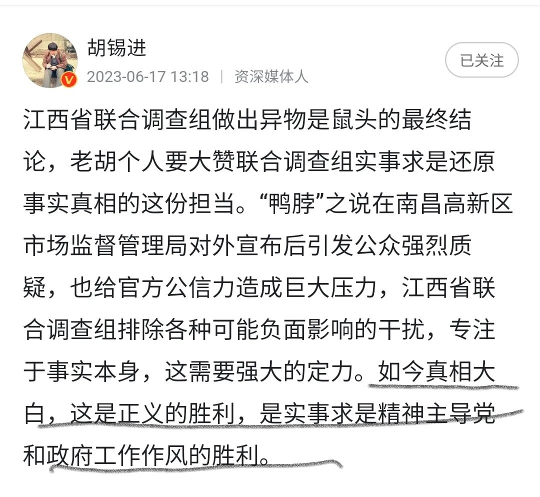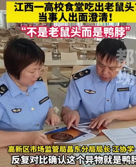 鼠头鸭脖”事件尘埃落定,联合调查组一锤定音:是鼠头,不是鸭脖。结论一出,也证明了几个不堪的事实:证明之前学校发的“情况通报”,满纸谎言;证明南昌市高新区市场监督管理局昌东分局局长,睁眼说瞎话。当然,也证明了:当事者,那个吃了“鼠头”饭的学生出来澄清,是被迫的。从此,“指鼠为鸭”将成为了一个新成语,将一些人钉在历史的耻辱柱上。今天“鸭脖”结论一出,评论区一片欢呼,纷纷赞扬“这是一场公众舆论的胜利”、“这是民意的胜利”。兴奋之意难以言表,还出现了甄嬛体“沉冤得雪”:臣妾此身从此分明了......或许,因为人人都知道那黑乎乎的东西到底是什么玩意儿,但大家都以为,按照以往惯例,他们会抵死不认错。想想北极鲶鱼,想想贵州溺亡的两位老师,鼠头鸭脖事件的结论,来的情理之中,意料之外!6月1日,江西工业职业技术学院,一学生在食堂用餐时,吃到了疑似老鼠头的异物。该同学恶心、气愤之余,拍了视频,找到食堂讨说法,工作人员的回答直接让人惊掉下巴:“这是鸭脖”。![]()
