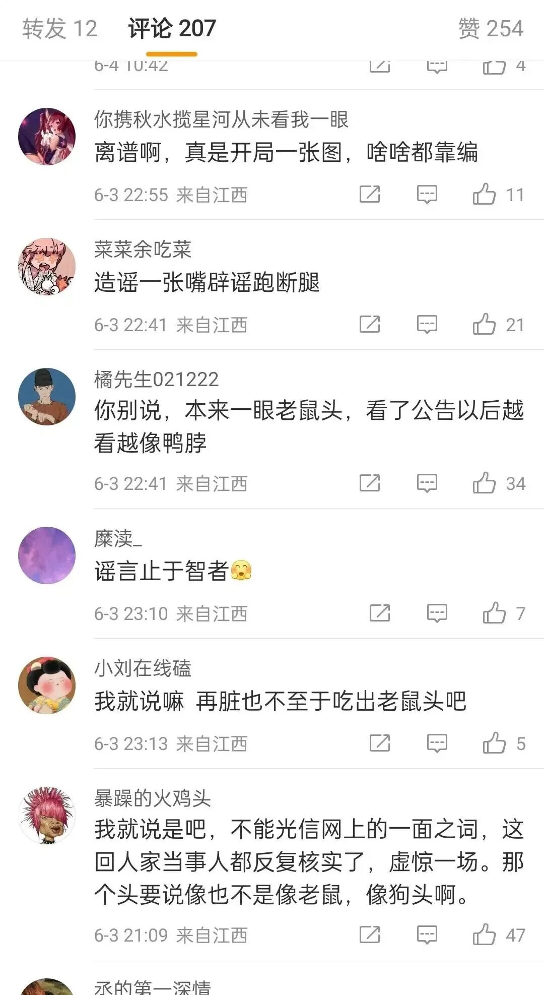 鸭脖与老鼠头,风马牛不相及,这两样东西居然也能搞混?学生将视频上传社交平台,很快引起舆论大哗。从曝光的视频中,我们可以清晰地看到,这尖尖的牙齿,仙气飘飘的长胡须,不是鼠头是啥?为平息物议,学校找来了南昌市高新区市监局来采样调查。调查结果很快出来了,市监局江局长亲自录视频辟谣,确认“异物”不是老鼠头,而是“鸭脖”。6月3日晚,涉事学校也发了通报,再次确认“异物”为鸭脖,为正常食物。接下来,拍摄视频的学生,也特意出面澄清,自己发现的是鸭脖。食堂否认,市监局检测,校方发公告,当事人澄清,貌似事情可以到此结束了,没想到网友的质疑声反而愈演愈烈。按以往惯例:官方表态,基本代表着盖棺论定,但这件事,实在与大众朴素的认知和生活常识离得太遥远,所以结论根本掩盖不了舆论。此事当中,最固执的无疑就是网友了,他们还硬生生地造出了一个新“成语”:指鼠为鸭。的确,将鼠头当鸭脖,不但侮辱了人格,侮辱了智商,还侮辱了勇气。有些事不能说,憋屈;有些事不敢说,窝囊。现如今,连个鼠头都不敢确认是鸭脖,还拿不拿我们当回事了?“鼠头鸭脖”事件的热度持续10天不退,舆论助推下,6月10日江西政府成立“6.1食品安全事件”联合调查组。最终,联合调查组通过一系列勘察,并由国内权威动物专家对学生拍摄的照片和视频,进行专业辨识,判定异物为:老鼠头。一场“指鼠为鸭”的闹剧终于结束,某种程度上,这的确是民意倒逼的结果。鼠头鸭脖事件后,有细心的网友扒出,涉事的江西工业职业技术学院,与老鼠的渊源颇深。2021年11月,该校食堂就发现老鼠,市场监管局介入调查。当时该校还发公告称,要“以此为戒,认真整改”。明明透过视频看到的就是带着獠牙的“老鼠头”,为何学校和市场监管部门就认定是“鸭脖”呢?大概,发生在2010年的一件食品安全事故,能为这一干人等“指鼠为鸭”找到答案:2010年3月,4名女士在河北某饭店的“干锅鸭”里发现老鼠头,按照《食品安全法》规定,卫生监督部门吊销了该饭店的卫生许可证,并禁止该饭店老板以后从事餐饮行业。普通饭店尚且如此,更别说一家服务上万名学生的学校食堂了,如果坐实了饭里有“老鼠头”,不仅要退出学校承包商的行列,也意味这这家餐饮公司,从此可以告别了这个行业了。而在食堂“鼠头鸭脖”事件后,学校也是一系列拿大家当傻子的“骚操作”:在邀请市监局检测证明的同时,积极引导学生进行正能量发言,还贴心地给出了回帖模板。于是,一堆顶着“江西”IP的网友,整齐划一地在留言区为“鸭脖”正名:![]()