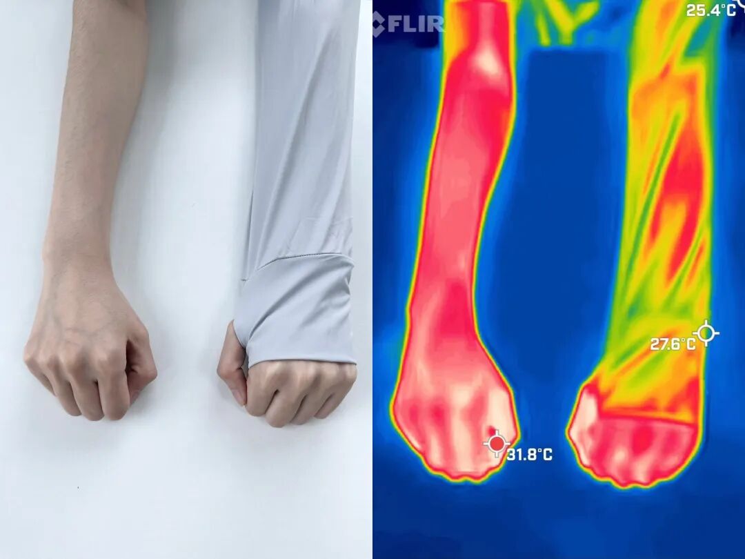 温感实验中也能看出,裸臂温度高达31.8度,穿上罗蒙防晒衣的手臂,只有27.6度,立降4度!