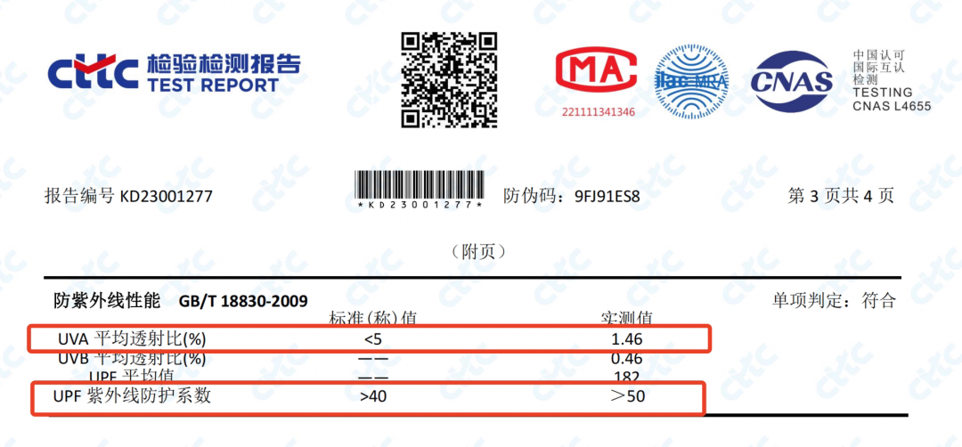 从质检报告看,咱们这款防晒衣UPF50+,T(UVA)AV透过率1.46%,小于5%,质检合格。